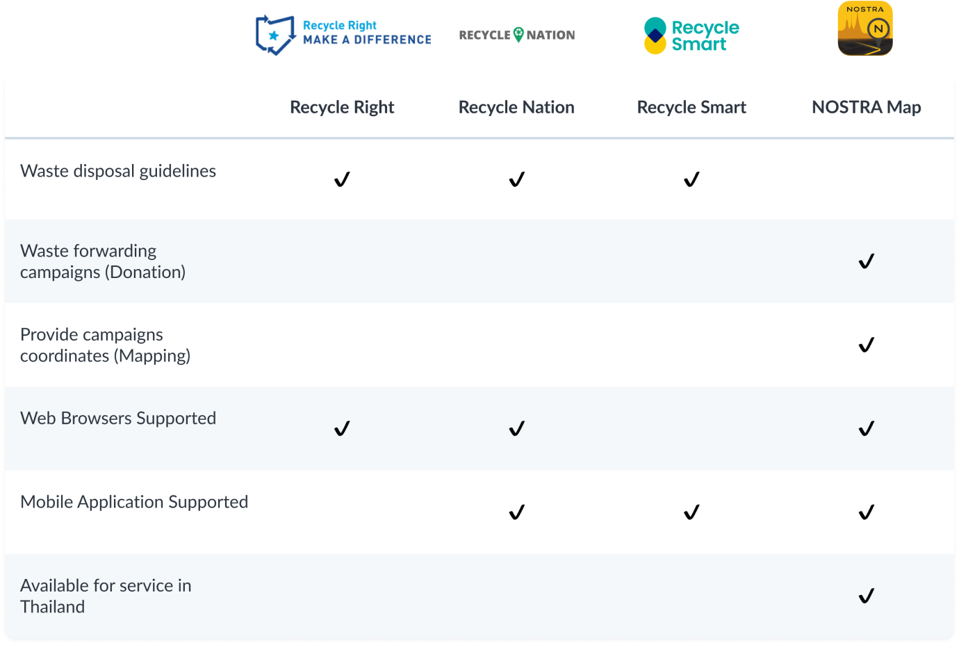 Currently, there's a lack of centralized platforms to help find waste forwarding or donation projects. For NOSTRA Map, even though they mapped the addresses of each campaign, it is not possible to search for them by the specific type of waste material. Furthermore, most platforms that provide recycling guides are not fully functioning in Thailand.
